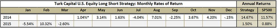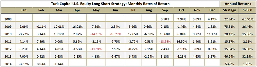SP500 results are based on the SPY (SPDR S&P500 ETF). Results take into account a 1% Management and 20% Incentive Fees as well as actual execution costs.*Results from April 2014 are from a proprietary trading account and are inclusive of pro forma fees. Net performance is not reduced by commissions on open positions for rate of return calculations. ROR is calculated in accordance with the Modified OAT method. Accounts opening or closing during a month are generally excluded from ROR calculations.